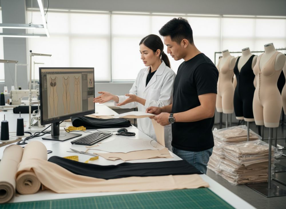 El soporte de ingeniería implica modelado 3D para patrones precisos en shapewear todo en uno, optimizando zonas de compresión. Fábricas avanzadas usan software CAD para simular ajuste, reduciendo iteraciones en un 30%, según estudios de Textil Journal (2023).